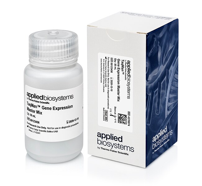 TaqMan™ 基因表达预混液含有 AmpliTaq Gold™ DNA 聚合酶(超纯)、尿嘧啶-DNA 糖基化酶、dNTP(含 dUTP)、ROX™ 惰性参比染料和经优化的缓冲液成分。
