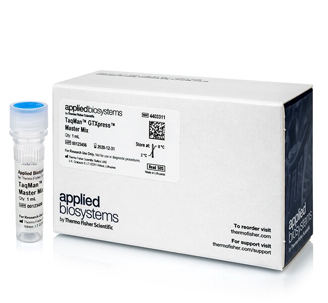 含有 1 mL 含 AmpliTaq™ Fast DNA 聚合酶 UP、dNTP、示踪染料和 ROX™ 染料的 TaqMan™ GTXpress™ 预混液 (2X)。足够用于 400 次反应。在 2-8°C 下储存。
