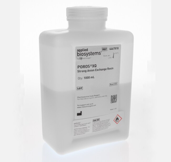 Thermo Scientific™ POROS™ XQ resin is a next-generation, high-capacity, high-resolution, salt-tolerant, strong anion exchange resin that that enables >140 mg/mL dynamic binding capacity in the presence of up to 6.6 mS/cm NaCl, while delivering exceptional separation performance.