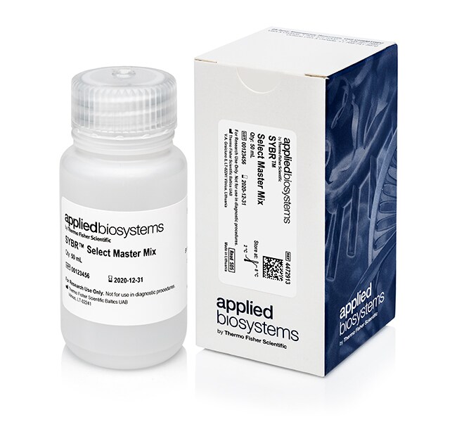SYBR™ Select Master Mix contains all the components needed for your real-time PCR reaction, except the template and primers, in a convenient 2X concentration premix. The master mix includes AmpliTaq™ DNA Polymerase, UP, a highly purified DNA polymerase with a proprietary hot start mechanism that provides exceptional specificity.