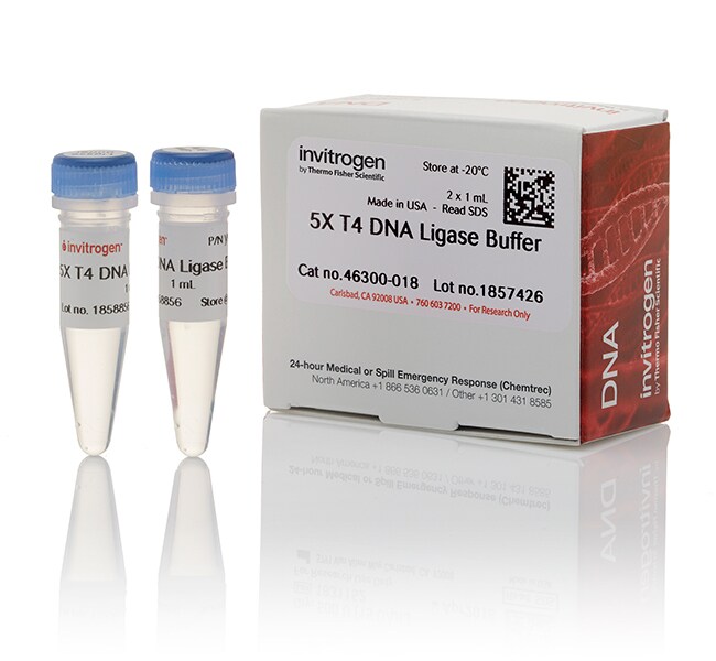 T4 DNA 连接酶随附一瓶 5X 反应缓冲液 [250 mM Tris-HCl(pH 值 7.6)、50 mM MgCl2、5 mM ATP、5 mM DTT、25% (w/v) 聚乙二醇-8000]。在 -20°C 条件下储存。