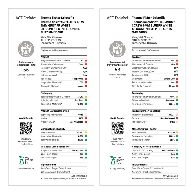 所有 SureSTART 样品瓶、瓶盖和隔垫均经过认证,符合作为我们生产工艺组成部分的物理参数规格要求。