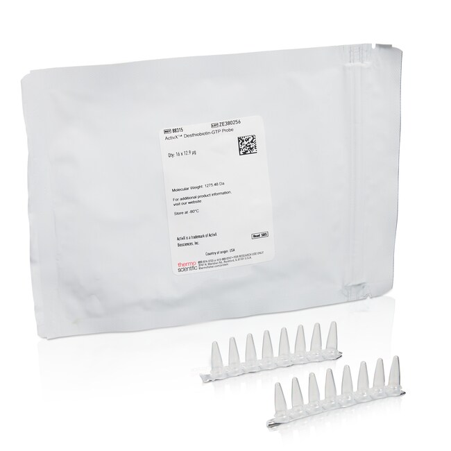 After removal of GTP or GDP nucleotides from enzymes, the desthiobiotin-GTP probe can be used to covalently modify conserved lysine residues in the GTPase nucleotide-binding site. Desthiobiotin-GTP can selectively enrich, identify and profile target enzyme classes in samples. Pre-incubation of samples with small-molecule inhibitors that compete with active-site probes can be used to determine inhibitor binding affinity and target specificity. The ActivX Desthiobiotin-GTP Probe covalently labels the active site of GTPases and GTPase subunits of G-protein coupled receptors.