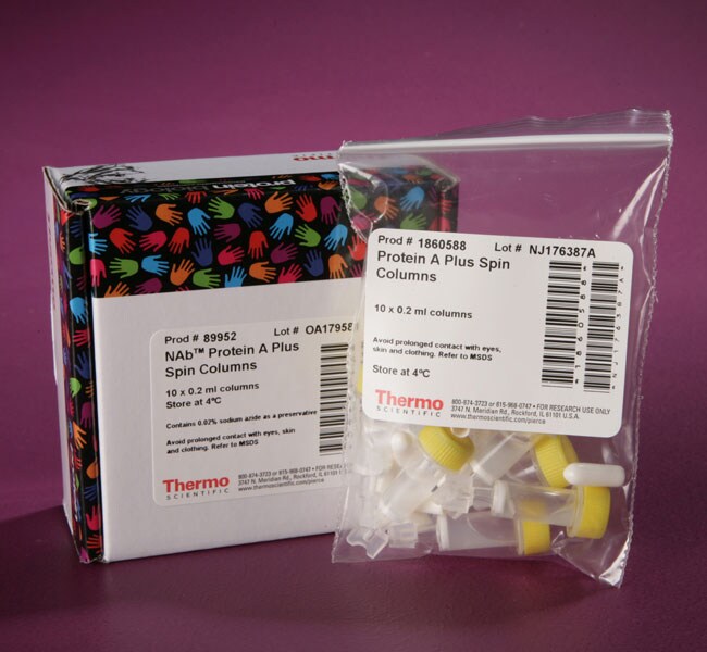 The Thermo Scientific Protein A Plus Agarose NAb Spin Columns are convenient for rapid, small-scale affinity purification of antibodies from a variety of sample types. Each column containing 0.2 mL of the immobilized protein resin enables quick purification of 100-1,000 μg of IgG from 25-500μL of serum or other sample. The actual amount of IgG purified varies depending upon the sample type and the specific spin column used.