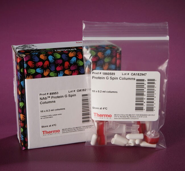 Thermo Scientific NAb 蛋白 G 离心柱便于对各种样品类型中的抗体进行快速、小规模亲和纯化。每个柱包含0.2 mL 固定化蛋白树脂,可从25-500 µL 血清或其他样品中快速纯化100-1,000 µg 的 IgG。实际纯化的 IgG 数量取决于样品类型和所使用的特定离心柱。