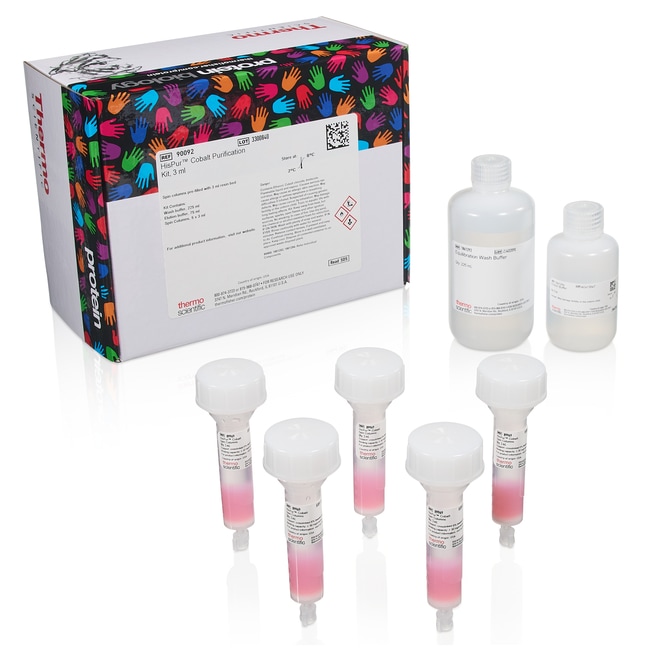 The Thermo Scientific HisPur Cobalt Purification Kit contains 3-ml HisPur spin columns, buffers, and collecting tubes for the purification of polyhistidine-tagged proteins. The HisPur Cobalt Resin in these columns is a tetradentate chelating agarose resin charged with divalent cobalt (Co2+) for obtaining high-purity his-tagged proteins with no metal contamination.