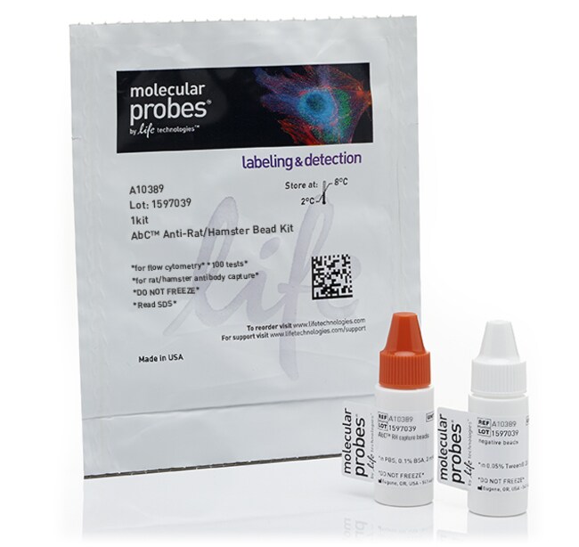 The AbC™ Anti-Rat/Hamster Antibody Compensation Bead Kit provides a consistent, accurate, and simple-to-use technique for the setting of flow cytometry compensation when using fluorochrome-conjugated to rat or hamster antibodies with any laser in flow cytometry.
