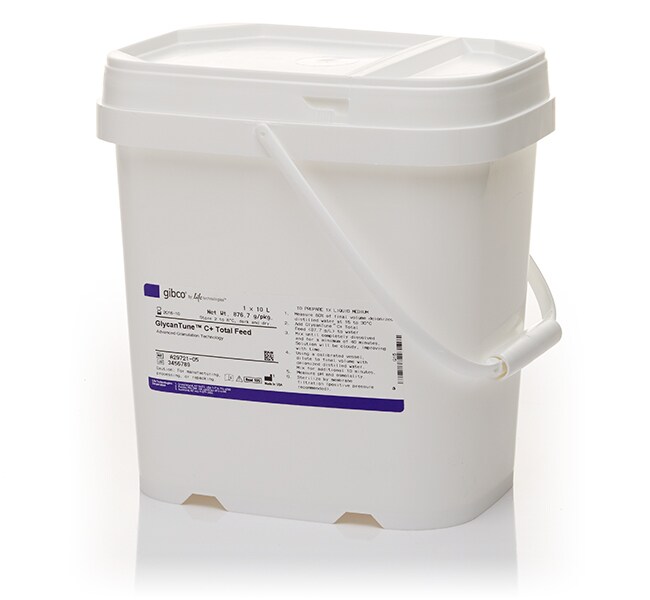 GlycanTune™ C+ 总补料是一种 AGT™ 或高级颗粒技术™产品,专为多种细胞系的流加培养而设计。使用时,这种干粉剂型的单组分总补料添加剂可将聚糖谱从 G0F 聚糖主型转变为 G1F 和 G2F 聚糖主型。本产品是一种非动物源性–、化学成分确定的制剂,不含蛋白质、水解产物或未知成分。GlycanTune C+ 总补料是一种易于复溶的 pH 中性溶液,建议配制的浓度范围为 87.7 g/L (1X) 至 175.4 g/L (2X)。因此,关键营养素可以以较小的体积输送。