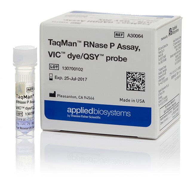 The Applied Biosystems™ TaqMan™ RNase P Assay with VIC™ dye-labeled QSY™ probe provides a pre-formulated assay for quantitating human RNase P. This assay enables relative gene expression quantification in cDNA samples when used with other gene expression assays. It consists of a VIC dye-labeled QSY probe plus sequence-specific forward and reverse primers. The assay can be used for multiplex or singleplex PCR reactions. For an assay with ABY™ dye-labeled probe rather than VIC dye-labeled probe, see Cat. No. 4485714.