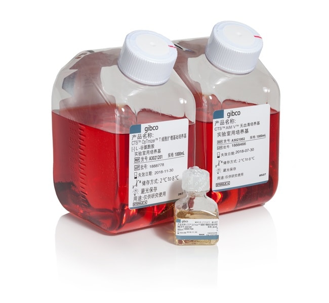 产品包装规格 CTS OpTmizer T-Cell Expansion SFM 包含两种组分:1 升 CTS OpTmizer T 细胞扩增基础培养基和 26 mL CTS OpTmizer T 细胞扩增辅助浓缩培养基,混合在一起就形成完全培养基。可提供完整的溯源性证明文件,例如原产地证书和分析证书,并且已编制药品主文件。