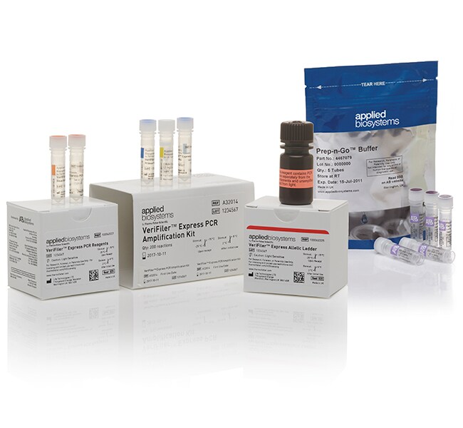 VeriFiler™ Express PCR 扩增试剂盒和 Prep-n-Go™ 缓冲液(5 管),结合了 VeriFiler™ Express PCR 扩增试剂盒特点以及使用 Prep-n-Go™ 缓冲液处理样本的便利性。VeriFiler Express 试剂盒是直接扩增型 STR 试剂盒,鉴别能力高且性能卓越,能够快速得出结果。它可对 GlobalFiler™ Express 试剂盒中包含的 22 个 STR 基因座以及具备高分辨率的 Penta D 与 Penta E 基因座和 2 个性别标记位点(Amelogenin 和 Yindel)进行多重扩增,最大限度与现有试剂盒保持一致,确保亲子鉴定和亲缘关系结论高度可靠。