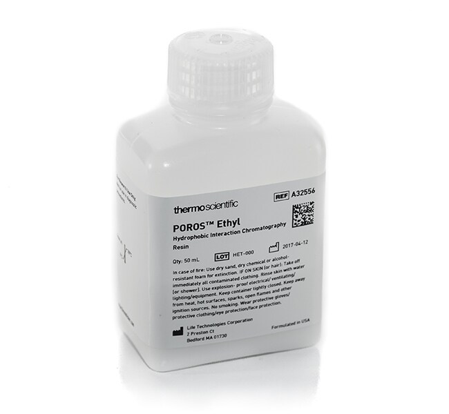These features of POROS Ethyl HIC Resin are a major improvement to the performance of traditional HIC resins, setting the standard for hydrophobic interaction chromatography. POROS Ethyl HIC Resin combines superior and consistent performance, exceptional customer support, strong operational excellence, and a strong legacy based on proven technology from a well-established chromatography resin supplier. This resin comes with complete technical and regulatory support. POROS Ethyl HIC Resin is available in various bulk package sizes for large-scale purification, as well as pre-packed columns for initial process development.