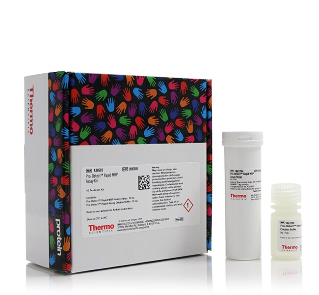 The Thermo Scientific Pro-Detect Rapid MBP Assay Kit is a single-use, dipstick lateral flow kit for quick, easy detection of maltose binding protein (MBP)-tagged proteins in protein expression and purification systems. This lateral flow assay uses membrane-based strips coated with dye-bound conjugated antibodies specific to the MBP tag to provide a visual, color readout for detection within ten minutes. This assay can be used to detect MBP-tagged proteins directly from cell culture media (supernatant) or cell lysates without any special instrumentation or handling.