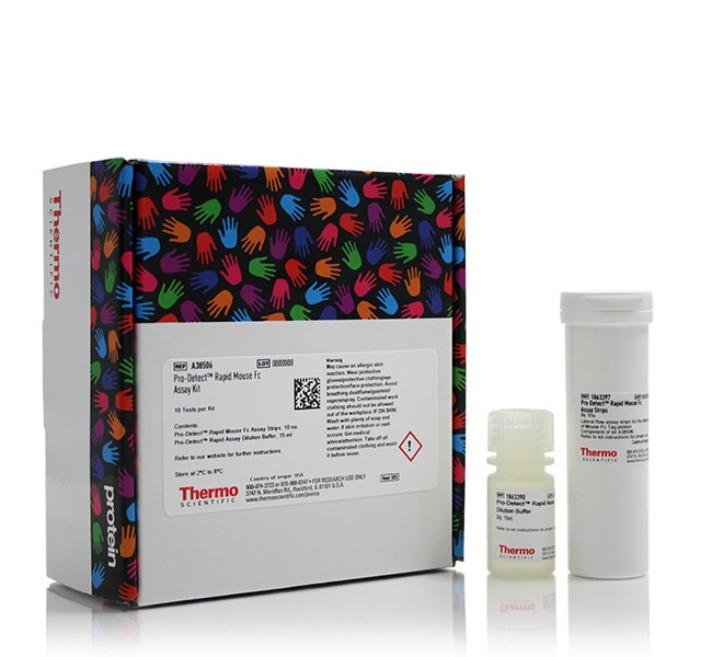The Thermo Scientific Pro-Detect Rapid Mouse Fc Assay Kit is a single-use, dipstick lateral flow kit for quick, easy detection of mouse Fc-tagged proteins in protein expression and purification systems. This lateral flow assay uses membrane-based strips coated with dye-bound conjugated antibodies specific to the mouse Fc tag to provide a visual, color readout for detection within ten minutes. This assay can be used to detect mouse Fc-tagged proteins directly from cell culture media (supernatant) or cell lysates without any special instrumentation or handling.