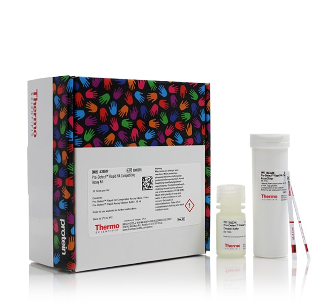 The Thermo Scientific Pro-Detect Rapid HA Competitive Assay Kit is a single-use, dipstick lateral flow kit for quick, easy detection of human influenza hemagglutinin (HA)-tagged proteins in protein expression and purification systems. This lateral flow assay uses membrane-based strips coated with dye-bound conjugated antibodies specific to HA tag to provide a qualitative detection within ten minutes. This assay can be used to detect HA-tagged proteins directly from cell culture media (supernatant) or cell lysates without any special instrumentation or handling.