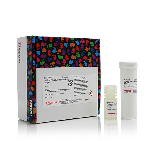 The Thermo Scientific Pro-Detect Rapid Streptag II Competitive Assay Kit is a single-use, dipstick lateral flow kit for quick, easy detection of Strep Tag II (sequence: PQKWSHPQFEK)-tagged proteins in protein expression and purification systems. This lateral flow assay uses membrane-based strips coated with dye-bound conjugated antibodies specific to Streptag II tag to provide a qualitative detection within ten minutes. This assay can be used to detect Streptag II-tagged proteins directly from cell culture media (supernatant) or cell lysates without any special instrumentation or handling.