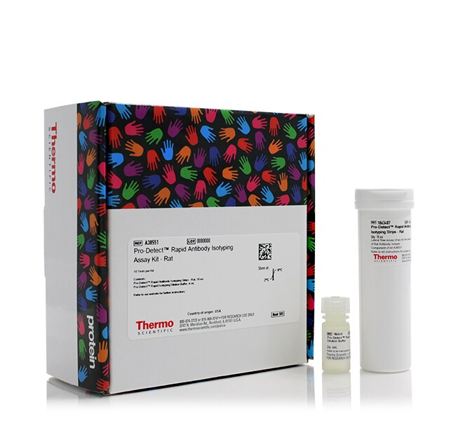 The Thermo Scientific Pro-Detect Rapid Antibody Isotyping Assay Kit - Rat is a single-use, dipstick lateral flow kit for quick, easy determination of rat monoclonal antibody class and subclass identity. This antibody isotyping assay uses membrane-based strips coated with dye-bound conjugated antibodies that provide a visual, color readout of the monoclonal antibody isotype within ten minutes. The kit determines rat IgG1, IgG2a, IgG2b , and IgG2c.