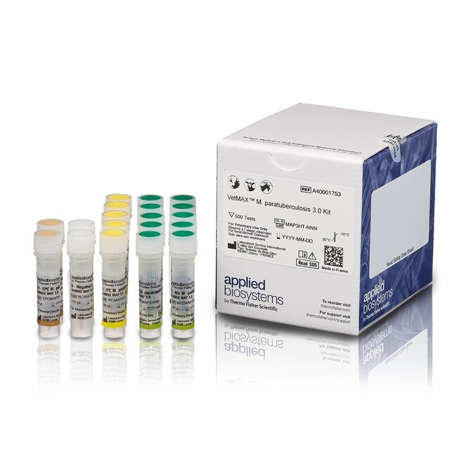 The Applied Biosystems VetMAX M. paratuberculosis 3.0 Kit utilizes real-time PCR for the sensitive and specific detection of Mycobacterium avium ssp. paratuberculosis (MAP) nucleic acid in animal samples, allowing for reliable and rapid detection of infected animals. The kit can be used to test for MAP in many species (cattle, sheep, goats, and camels) and a wide variety of sample types (feces, milk, environmental samples).