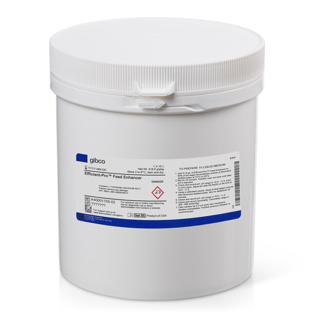 Efficient-Pro DPM Feed Enhancer has been formulated as a chemically defined, animal-origin-free cell culture feed supplement used in the bioproduction of mAbs and other therapeutics in traditional batch and fed-batch bioprocessing workflows, particularly in combination with CHO-K1 cell line variants. Efficient-Pro DPM Feed Enhancer is a balanced formulation designed to meet the metabolic needs of mAb production and does not contain growth factors or insulin to support batch-to-batch consistency and production efficiency. It has been shown to improve productivity in a CHO-K1-GS cell line when paired with Efficient-Pro Feed 3 and Efficient-Pro Medium.