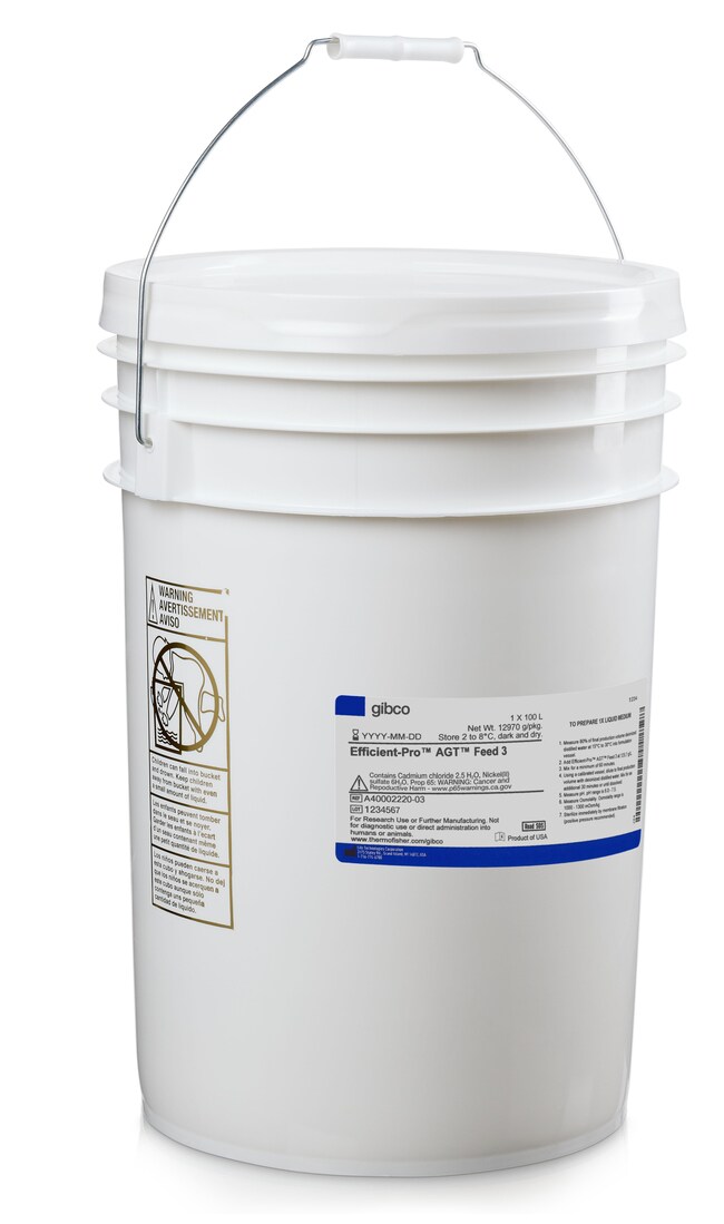 Efficient-Pro AGT Feed 3 has been formulated as a chemically defined, animal-origin-free cell culture feed used in the bioproduction of mAbs and other therapeutics in traditional batch and fed-batch bioprocessing workflows, particularly in combination with CHO-K1 cell line variants. Efficient-Pro AGT Feed 3 is a balanced formulation designed to meet the metabolic needs of mAb production and does not contain growth factors or insulin to support batch-to-batch consistency and production efficiency. It has been shown to improve productivity in a CHO-K1-GS cell line when paired with Efficient-Pro Feed Enhancer and Efficient-Pro Medium.