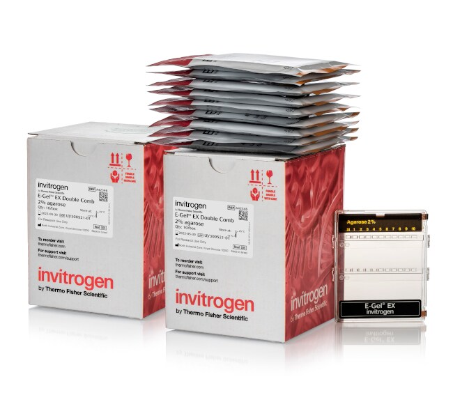 Invitrogen E-Gel EX 双电泳梳预制琼脂糖凝胶设计用于进行超灵敏的便利 DNA 样品电泳,仅需 5–8 分钟即可完成。每个 E-Gel EX 双电泳梳凝胶盒包含高效凝胶分离和分析所需的所有组件和染色剂—只需上样并运行。E-Gel EX 双电泳梳凝胶非常适用于分析 PCR 产物、限制性酶切、质粒制备和基因分型样品。