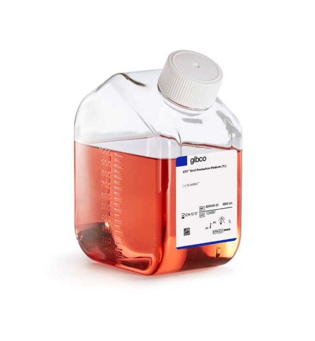 Gibco CTS 病毒生产培养基化学成分明确、无血清、无蛋白质、非动物源性且无酚红,是 CTS AAV-MAX Helper-free AAV 生产系统的一部分。CTS 病毒生产培养基是专门为 CTS 病毒生产细胞2.0(适应悬浮培养的 HEK293F 衍生细胞)的生长和转染而开发,用于腺相关病毒 (AAV) 的生产。
