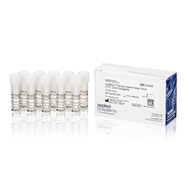 The VetMAX African Swine Fever Virus I177L DIVA Reagents kit contains a single tube with the primer/probes and master mix needed for a qPCR assay targeting the ASFV-GΔI177L recombinant vaccine. It offers rapid testing and can be used as a reflex assay to differentiate infected animals from animals vaccinated with ASFV- GΔI177L recombinant vaccine after screening for African Swine Fever with the VetMAX African Swine Fever Virus Detection Kit (Cat. No. A28809). Positive controls for the assay are available separately (Cat. No. A59394).