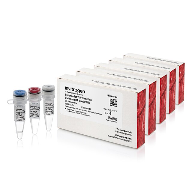 Invitrogen SuperScript IV Template-Switching RT Master Mix is designed for high template switching efficiency in cDNA synthesis reactions. It contains SuperScript IV Reverse Transcriptase, RNase Inhibitor, and all other reverse transcription reaction components in a convenient premixed format. Only RNA template, RT primer, and template switching oligo (TSO) of choice need to be added.