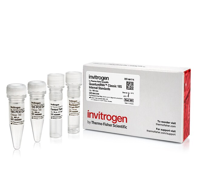 QuantumRNA™ 经典 II 型 18S 内部标准品 (SKU# AM1717) 生成 324 bp 的 PCR 产物,QuantumRNA™ 通用型 18S 内部标准品 (SKU# AM1718) 在较广泛的真核生物(包括动物、植物和许多原生动物)中发挥作用,并生成 315 bp 的 PCR 产物。