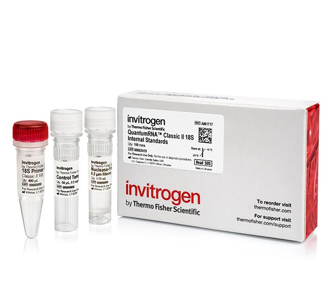 QuantumRNA™ 经典 18S 内部标准品 (SKU# AM1716) 生成 489 bp 的 PCR 产物,QuantumRNA™ 通用 18S 内部标准品 (SKU# AM1718) 在较广泛的真核生物(包括动物、植物和许多原生动物)中发挥作用,并生成 315 bp 的 PCR 产物。