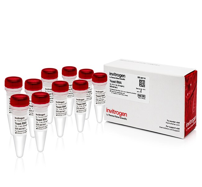 纯化的 Torulla Ambion™ 酵母 RNA 适合在核酸沉淀物中用作共沉淀剂。它不能用于外源 RNA 抑制的反应,是高质量共沉淀剂的最廉价来源。该总 RNA 制剂以浓度为 10 mg/mL 的十管 1 mL 蒸馏水(经焦碳酸二乙酯处理)溶液形式提供。其通常以 10–20 µg/mL 的工作浓度使用。