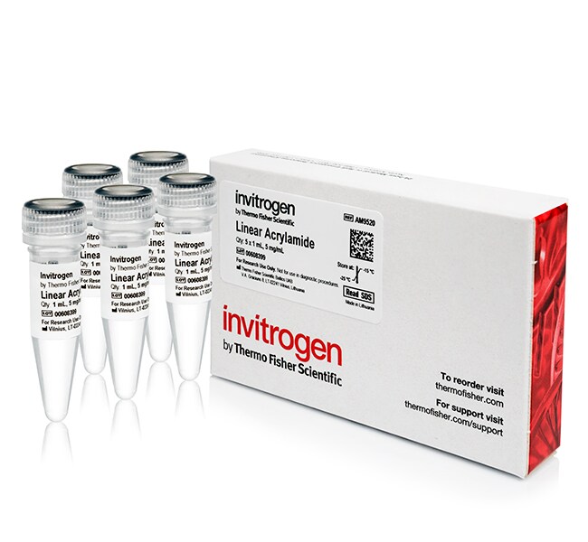 Ambion™ Linear Acrylamide (5 mg/mL) is for use as a nucleic acid coprecipitant and is ideal for PCR and RT-PCR reactions since small amounts of contaminating nucleic acids present in other carriers could be amplified. It is supplied in five tubes containing 1 mL each.