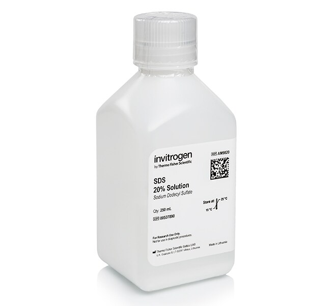 Ambion® 分子生物学级、SDS、20% 溶液共一瓶 (250 mL)。该缓冲液经认证具有无 RNase、经济实惠和即开即用等特点了解更多信息