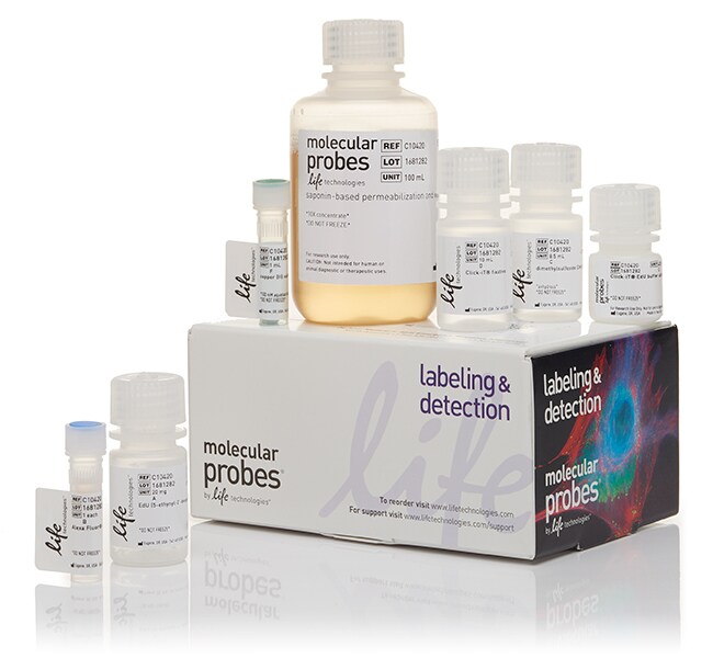 含有 EdU(5-乙炔基-2'-脱氧尿苷)、Alexa Fluor™ 488 叠氮化物、无水二甲基亚砜 (DMSO)、Click-iT™ 固定剂、Click-iT™ 皂苷基透化液和洗涤缓冲液、硫酸铜 (II) 和 Click-iT™ EdU 缓冲液添加剂。