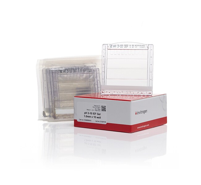 Novex™ IEF 凝胶为 5% 聚丙烯酰胺,由高纯度丙烯酰胺、双丙烯酰胺、TEMED、APS、超纯水和 2% 两性电解质组成。其不含变性试剂。