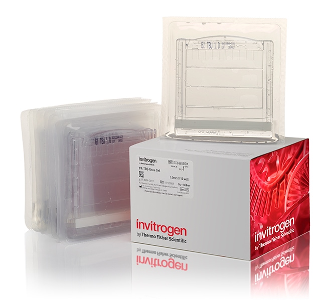 Novex TBE-Urea gels are made with high-purity reagents, including Tris base, boric acid, EDTA, acrylamide, bisacrylamide, TEMED, APS, and 7M urea. Strict quality control ensures that gels and buffers are DNase- and RNase-free.