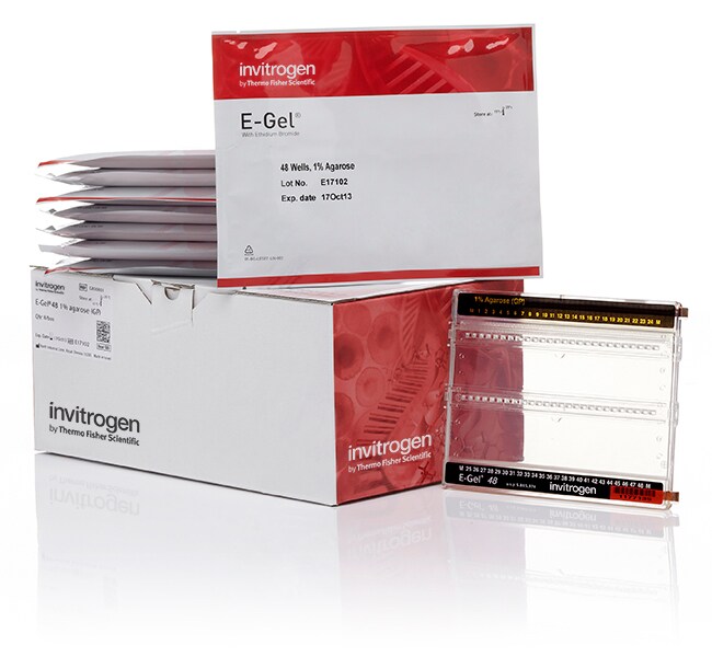 Invitrogen E-Gel 48 高通量预制琼脂糖凝胶(含 SYBR Safe DNA 凝胶染色剂)设计用于进行快速、便利和危害更小的 DNA 样品电泳。每个 E-Gel 琼脂糖凝胶盒均包含有效凝胶分离和分析所需的所有组分和染料—,只需上样并开始电泳即可。