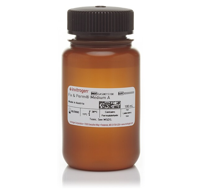 固定培养基(培养基 A)是 FIX & PERM™ 细胞透化试剂盒的组分。该试剂盒用于流式细胞分析,以固定和透化悬浮液中的细胞,可使抗体进入细胞内靶标,而不影响散射特性。