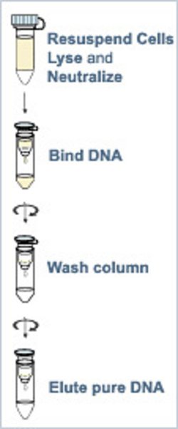 收获并裂解细菌培养物。然后通过离心清除裂解物,并将其施加到硅胶柱上,以在高盐浓度下选择性地结合 DNA 分子。洗涤吸附的 DNA,以去除污染物,并在少量洗脱缓冲液或水中洗脱纯质粒 DNA。纯化的 DNA 可立即用于所有分子生物学程序,如快速和常规限制性内切酶酶切、PCR、体外转录、转化和自动测序。组分 重悬溶液 裂解液 中和溶液 洗涤液(浓缩) RNase A 溶液 洗脱缓冲液 离心柱 收集管 详细方案