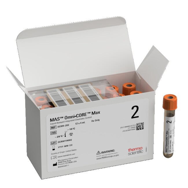 Consolidate general chemistry and serum protein QC processing into a single product offering three distinct levels with Thermo Scientific MAS Omni·CORE Max Controls. Value assignment is provided for key integrated instrument systems. Load-and-Go barcoded1 tubes for improved efficiency and daily time savings 1Barcodes available for selected instruments.