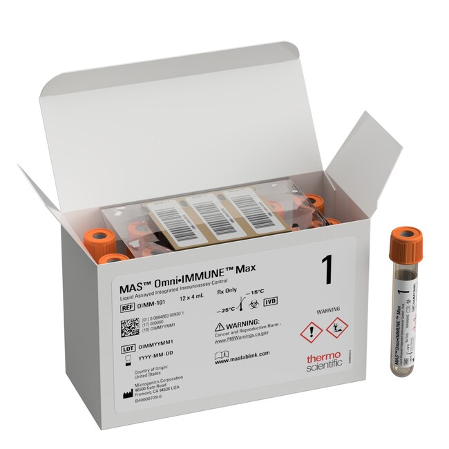 Consolidate routine immunoassay, tumor marker and specialty immunoassay QC processing into a single product offering three distinct levels with Thermo Scientific MAS Omni·IMMUNE Max Controls. Value assignment is provided for key integrated instrument systems. Load-and-Go barcoded