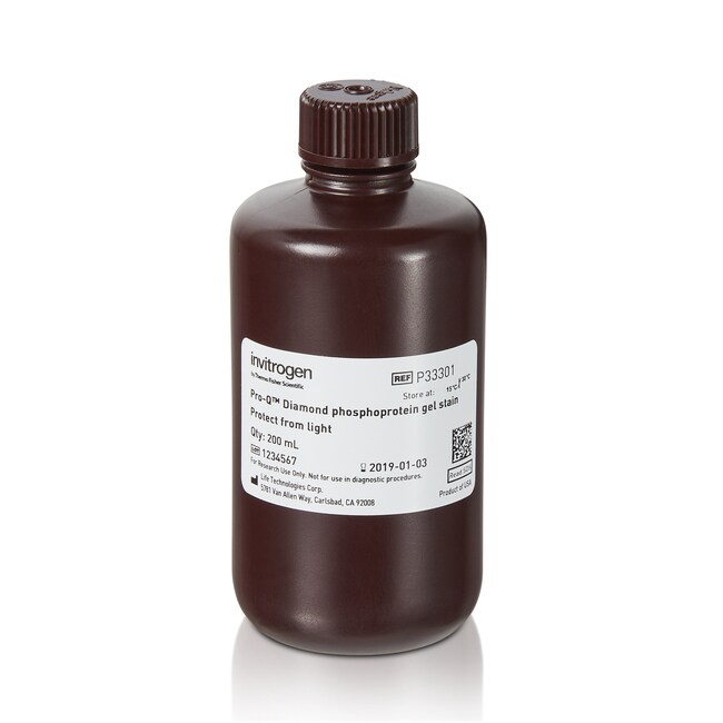 'Protein phosphorylation plays a vital role in the regulation of most aspects of cellular activity, being key to propagating messages within signal transduction pathways and to modulating protein function. Pro-Q Diamond phosphoprotein gel stain is suitable for the fluorescence detection of phosphoserine-, phosphothreonine-, and phosphotyrosine-containing proteins directly in sodium dodecyl ... More