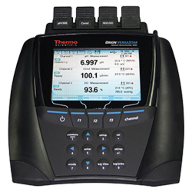 DescriptionOrion Versa Star Pro benchtop meter kit with pH/ISE/mV module, conductivity/TDS/salinity/resistivity module, RDO/DO module, ROSS Ultra Triode epoxy-body pH/ATC electrode, DuraProbe 4-cell conductivity sensor, RDO optical DO sensor, stirrer probe, solutions and stand