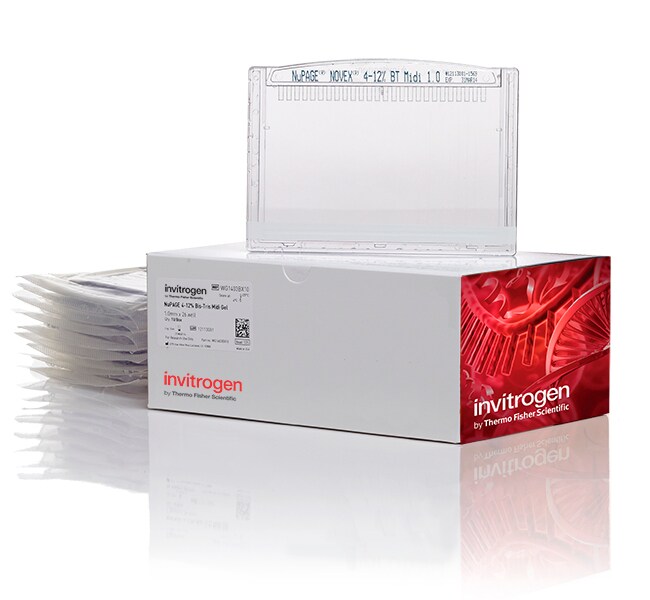 NuPAGE Bis-Tris 预制胶适用于变性凝胶电泳应用。要实现最佳样品制备,请使用 NuPAGE LDS 上样缓冲液 (NP0007) 和 NuPAGE 样品还原剂 (NP0004)。在电泳缓冲液中使用 NuPAGE 抗氧化剂 (NP0005) 可在电泳期间保持蛋白质的还原状态,并达到最大的条带清晰度。本凝胶可以使用 NuPAGE MES SDS 电泳缓冲液 (NP0002) 进行电泳,以更好地分离小蛋白,或使用 NuPAGE MOPS SDS 电泳缓冲液 (NP000102) 进行电泳,以分离中到大分子量蛋白。