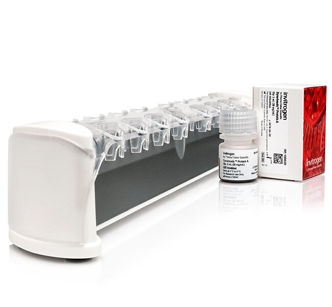 The Dynabeads Protein A and Magnet Starter Pack combines Dynabeads Protein A magnetic beads for immunoprecipitation with the magnet preferred for use with 1.5 mL microcentrifuge tubes for purchasing convenience. Each mL of beads is sufficient for 20 reactions, and the magnet holds 16 x 1.5 mL microcentrifuge tubes. Dynabeads Protein A beads and the DynaMag-2 magnet are also available separately.