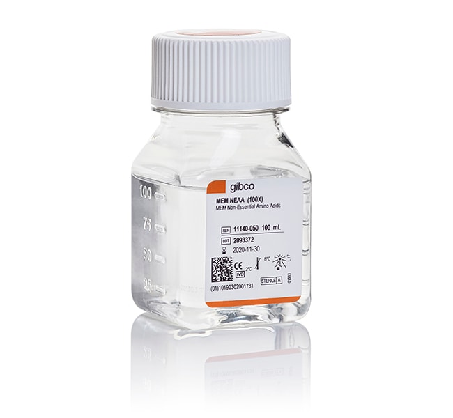 Gibco™ MEM Non-Essential Amino Acids are used as a supplement for cell culture medium, to increase cell growth and viability. Gibco™ MEM Non-Essential Amino Acids contains the same non-essential amino acids found in the standard Minimum Essential Medium (MEM) at a strength of 100X. The complete formulation is available.