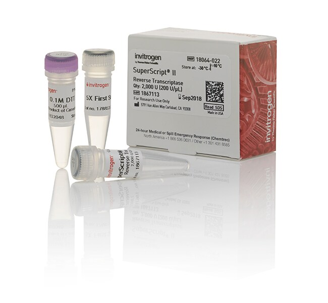 Invitrogen SuperScript II Reverse Transcriptase is a genetically engineered MMLV reverse transcriptase (RT) with reduced RNase H activity and increased thermal stability compared to wild-type MMLV RT. Mutations in the RNase H domain of the enzyme eliminate degradation of the RNA during first-strand cDNA synthesis, which results in higher yields of full-length cDNA.