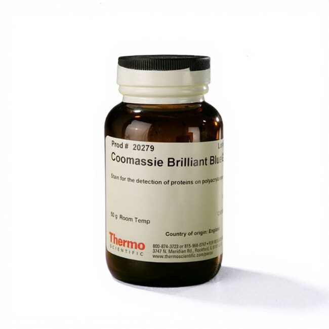 Thermo Scientific Pierce Coomassie Brilliant Blue dyes are composed of one of the most common forms of coomassie dye, which is a key component of various colorimetric protein gel stains.