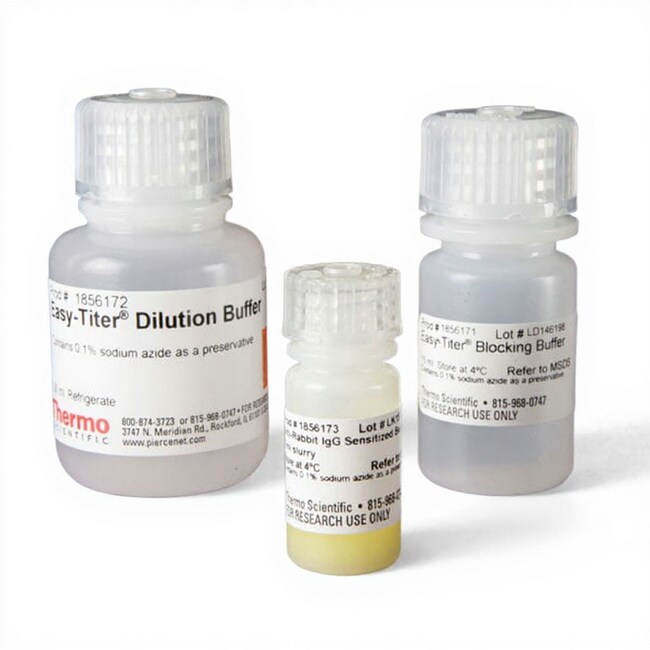 The Thermo Scientific Easy-Titer Rabbit IgG Assay Kit includes antibody-sensitized microspheres to measure the specific concentration of antibodies by an easy and rapid microagglutination technique using standard microplates and UV-Vis plate reader (spectrophotometer). This kit is specific for rabbit IgG and, unlike total protein assays, can specifically measure the concentration of target antibody in samples (e.g., serum, plasma, culture supernatant) that contain other proteins. It is sensitive, requiring very small sample volumes. Antibody concentration is determined from the assay response (absorbance) by comparison to a standard curve prepared using dilutions of a known antibody sample (sold separately).