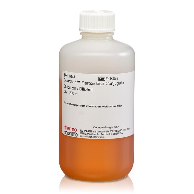 Thermo Scientific Guardian Peroxidase Conjugate Stabilizer/Diluent preserves the functional integrity and activity of horseradish peroxidase conjugated antibodies and other proteins at very dilute concentrations for long-term storage.